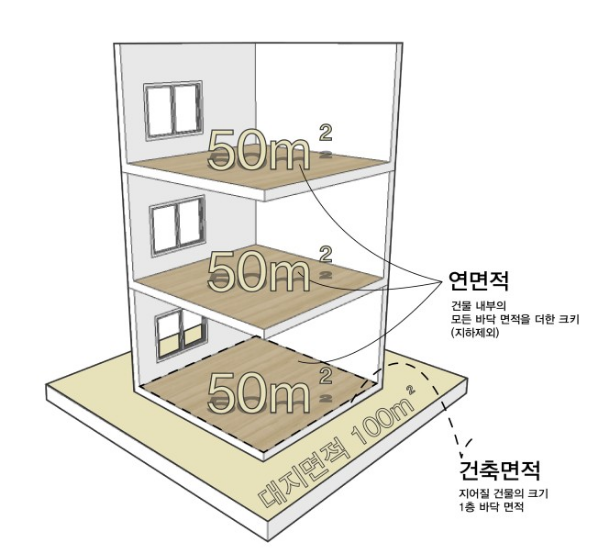 하나의 건축물의 각층의 바닥면적의 합계. 연면적에는 층수에 산입되지 않는 지하층이나 옥상 부분이 포함되나 승강기탑, 계단탑, 망루 등과 옥상 또는 지하에 설치하는 물탱크, 기름탱크 등의 설비를 위한 건축물은 면적산정에서 제외됨.