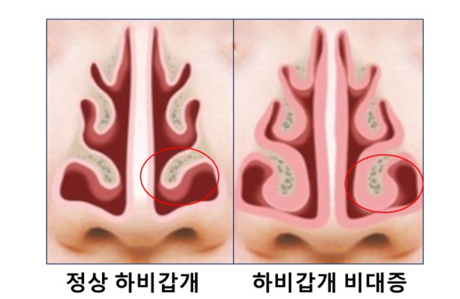 비갑개가 알레르기, 비염 등의 원인으로 비대/비후된 경우 코안이 좁아져서 코가 막힙니다.
