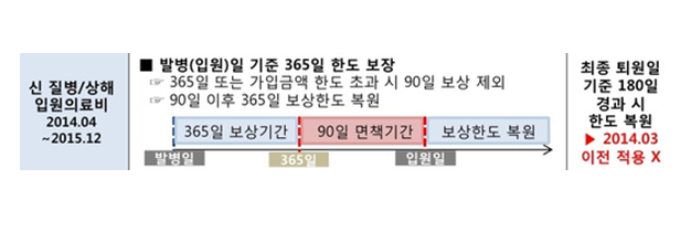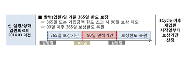'상해입원의료비' - 최초 입원일로부터 365일까지 보상하고 90일 면책기간 후 다시 365일 보상