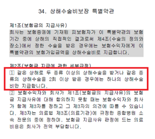 상해수술비 특약 약관내용을 보게 되면 실비와 같이 "두 종류 이상의 상해수술을 받거나 같은 종류의 상해수술을 2회 이상 받은 경우에는 하나의 상해수술비만 지급합니다"라고 기재되어 있듯이, 철심/핀제거 수술은 해당되지 않습니다.
